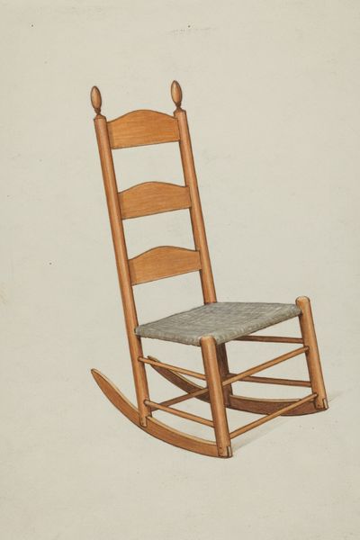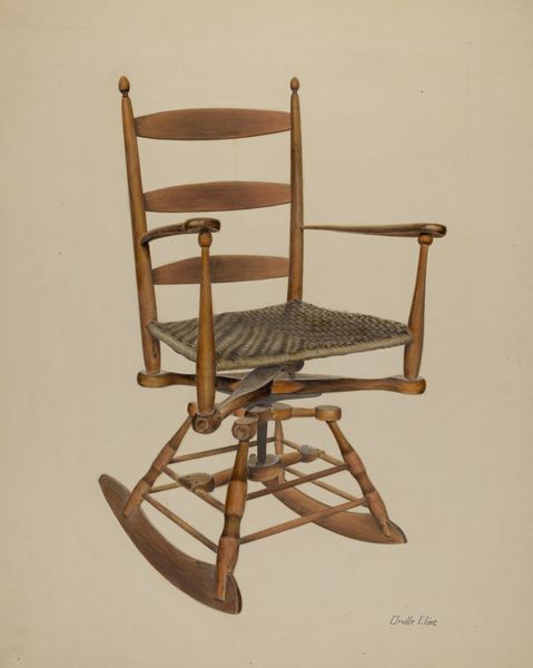 Editor: This is Frank Eiseman’s "Clock Reel," made around 1938. It's a watercolour drawing of a rather peculiar looking contraption, almost steampunk in its feel. There’s something quite static about it though, despite its potential for movement. What do you see in this piece, what story does it tell you? Curator: Ah, the quiet dignity of the everyday! I see in this clock reel a poem to usefulness, to the beauty inherent in simple function. Isn't it interesting how Eiseman isolates it, floating on the page? There's a gentle humour here, a slight elevation of the mundane to the monumental, almost as if he is making a joke for only the cleverest person to get. Does that chime with your impressions at all? Editor: Absolutely! I like how you see the humour in it. It makes me wonder if it’s a comment on the machine age, a nostalgic nod to handcrafts in a time of mass production. Curator: Perhaps, but I wonder if there's also a personal element? Maybe he once had an item just like this sitting in the background as he drew, almost a part of his own furniture... Think how an artist builds an affinity for items, it becomes imbued with significance, doesn't it? We imbue inanimate objects with the warmth and familiarity of life! Editor: That's a lovely thought! It reframes the artwork for me, making it less about industrial commentary and more about intimate memory. It could easily have been his dad’s device or mum's or wife's item; what you say is right! Thank you! Curator: My pleasure. Always look beyond the obvious, darling; the soul of art hides in the unexpected corners. You should buy an item just like this and keep it in your hall of memories too!