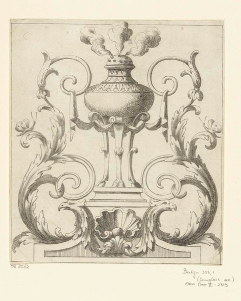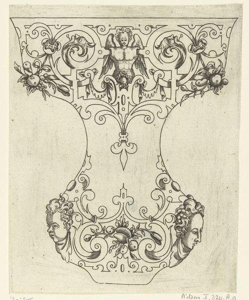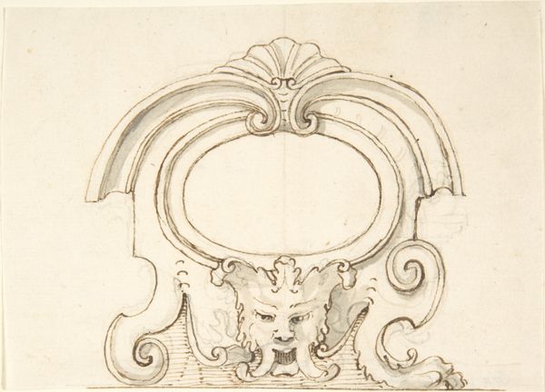 Curator: It’s intriguing, isn’t it? This drawing, held at the Metropolitan Museum, presents "Drawing of a Grotesque after a 16th-century Decorative Relief.” Scholars place its creation sometime between 1770 and 1830, and attributes it to Filippo Cretoni. Editor: Immediately, I'm struck by the sketchiness of the graphite, which somehow clashes and contrasts against what looks like rigid neoclassicism. You'd almost expect a sharper, cleaner line. I want to feel the weight of the implement in the hand that holds the pencil, trace that production back into time... Curator: Yes, look closer, it embodies a very linear approach—a devotion to form. It speaks volumes about the Neoclassical interest in revisiting, reimagining and recoding past artistic traditions, where clean, legible lines are supreme to guide the eye. Notice how it's built out of historical symbols too, right? Editor: Absolutely. You've got what seems to be an eagle, some torchieres, scrolls, and even a grotesque face centered within the structure, though they all have a bit of levity to them; a clear intention in choosing certain tools, and certain textures over others to capture its appearance on paper. Curator: Indeed, a catalogue of iconography, a parade of archetypes for anyone aware of the history and memory bound into visual culture. The eagle, often associated with power and empire, poised above what seems to be torches, perhaps referencing enlightenment…and a face that, though grotesque, is somewhat softened, tamed. Editor: The layout is striking – its top down arrangement resembles the artistic approach toward monumental architecture. This makes you think about where it sits, within what rooms, or maybe to be set amongst urban squares and structures, all that pencil and pressure. I want to feel those materials rubbing up against it too – marble and limestone maybe? Curator: The interplay of symbolism, from antiquity through the Renaissance, refined into the Neoclassical idiom makes for a layered experience that asks for slow and studied seeing to unpack all the social histories at play. Editor: To touch back on production, that relationship to craft makes this object stand out. A copy, or perhaps an exploratory sketch… its intention to inform some architectural form. Curator: Looking again with your points in mind has really reshaped my perception of this work. It's become richer, somehow. Editor: And seeing it through your iconographic lens shows how deeply the symbolic can still affect materials and methods even hundreds of years after its cultural value.