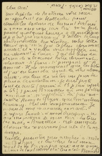 This is a letter written in pen by the French artist Émile Bernard, probably in the 1890s, to Héloïse Bernard-Bodin. The letter is a commonplace in the history of art; as a personal document, it is a form of literature. But its status as a document worth preserving is defined by the fact that its author was a painter. How does this affect our reading of it? How does the letter create meaning through its cultural and historical associations with the life of an artist? Is it of interest because it contains information about Bernard's life and thought, or is it an artwork in itself? Does it critique the institutions of art? A historian might make use of the letter to understand more about Bernard, his family and friends, and the artistic world in which he moved. The meaning of art is always contingent on its social and institutional context, and that context requires extensive research to uncover.