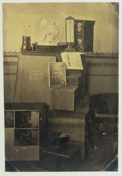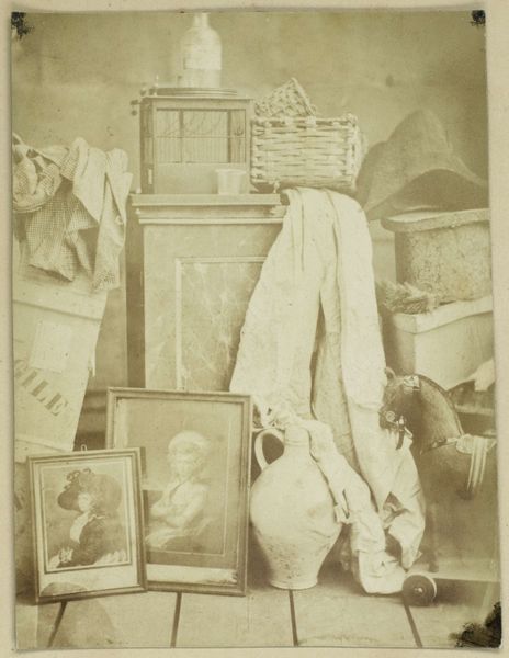 Curator: This remarkable still life before us, titled "Stilleven met een kleine kopie van 'Ariadne auf dem Panther', een 'Schneeball-vaas', bloemen en een boek," was captured by Eduard Isaac Asser around 1852. The photograph is held here at the Rijksmuseum. Editor: It feels very much of its time, a delicate dance between fragility and display. There's almost a spectral quality to the image, with the soft focus and muted tones lending a dreamlike air. It evokes that mid-19th century aesthetic with an interest in posing the items as subjects. Curator: Indeed. As a piece of early photographic art, this work allows us a glimpse into the social conventions and the material culture of the era. The 'Schneeball-vaas', a 'snowball vase,' was a coveted decorative object, suggesting a degree of affluence and cultivated taste. Note the placement of the book as a statement of literary appreciation, aligning perfectly with middle-class cultural aspiration. Editor: Right, but it's also interesting to me that there's a small copy of 'Ariadne auf dem Panther' showcased there. The myth of Ariadne abandoned yet powerful—placed under glass and reduced. Curator: Precisely! The act of photographing art objects, especially in a carefully curated still life, becomes an exercise in establishing a certain hierarchy and asserting cultural capital. How artworks are treated is an argument on social hierarchy. The use of sculpture, along with books, suggests that high culture should have a revered place. The flowers introduce the transience of beauty. Editor: And of course, photography itself was emerging as a medium of representation—making artwork reproducible, although I suspect, it also served an almost preservationist goal here as well, capturing a perfect arrangement for posterity and framing domestic items. Curator: An excellent point. Considering this still life within the larger context of early photography, we might reflect on its impact on art's accessibility, shifting notions of beauty and the intersection of aesthetics and consumerism in bourgeois society. Editor: Definitely. Seeing it with this historical insight has sharpened my own appreciation for how such seemingly simple compositions contain such layers of social significance, how they present objects for consumption rather than practical reasons.