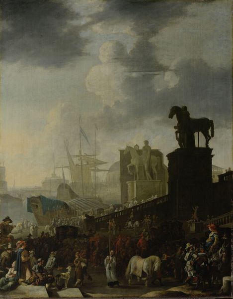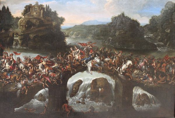 Curator: As we gaze upon Peter Paul Rubens' "Tournament in front of Castle Steen," created around 1637, currently held at the Louvre, one is immediately struck by the dynamism. Editor: Absolutely! It’s incredibly tactile. I am drawn to how the paint application conveys the chaotic energy of the tournament. You can almost feel the grit and sweat. It screams materiality and labour. Curator: Indeed. Observe how Rubens constructs a vibrant choreography, layering figures, horses, and the architecture itself to orchestrate a balanced yet frenetic visual experience. The color palette, while earthy, uses sharp contrasts to create depth and visual interest. Editor: The application of those earthy pigments is also intriguing. I'm curious about where Rubens sourced his pigments, how they were processed. That act of pigment creation is crucial, informing the entire material narrative, the physicality of representation. Curator: Such detail enriches the social implications as well. This wasn't a common, everyday activity. Depicting the aristocratic pageantry is essential to the subject. Observe how it elevates the spectacle itself, inviting the viewer into a world of noble leisure. Editor: Certainly. And from a purely physical production aspect, one can only speculate on the resources invested, the man hours, and the systems in place to make it possible. Highlighting not just an elite pastime, but also all the supporting labour structures behind them. It’s like excavating a cultural record one brushstroke at a time. Curator: It’s certainly a complex intersection of technique, symbol, and cultural insight. Reflecting on the details—the brushstrokes, the colours, the intentional juxtaposition of figures. I come to see the formal elements creating meaning through sheer craft. Editor: Ultimately, this analysis grounds us in how materials were handled and deployed, enabling narratives of power, pleasure, and privilege to come alive, which informs what this piece meant then, and can still mean today.