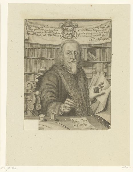 This engraving is Jacob Andreas Fridrich's portrait of Johann Arndt at age 66. The oval frame contains Arndt in his scholarly robe, positioned above a plinth that supports books. Note how Fridrich uses line and texture to render detail, contrasting the solid darks of Arndt's robe with the fine white lines delineating his features. The composition divides neatly into thirds, each layered horizontally. At the top, the curves of the oval are echoed in the soft, voluminous form of Arndt's beard, drawing our eye to his face. This focus is intensified by the firm architectural base in the lower third, creating a stage for the portrait. In the middle we see books and the inscription. Consider how this arrangement reflects prevailing notions of status and intellect, literally elevating Arndt above a foundation of knowledge. Here, the formal structure supports the symbolic, creating a visual hierarchy that invites contemplation on knowledge, authority, and representation.