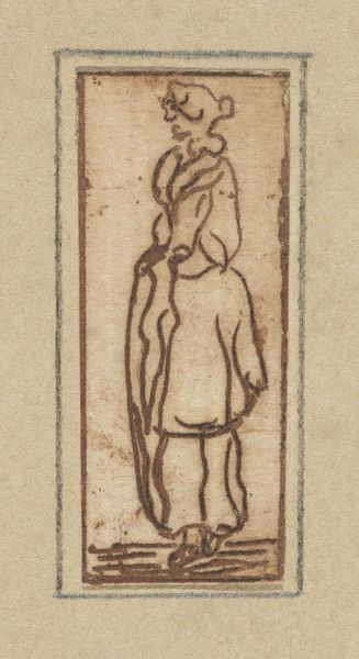 Here we see a small etching of a standing man, created by Jacob Hoolaart in the 18th century. During this era, the Dutch Republic was experiencing a period of economic decline. It's also known as the 'Periwig era' because of the popularity of periwigs among men of status. The man in the etching, with his simple attire and hat, seems to represent the common man, walking with his hands tucked into his sleeves. Jacob Hoolaart, during his artistic career, served as a city official, which gave him insight into the lives of ordinary citizens. The artwork invites us to reflect on the daily lives and struggles of the working class during a time of economic hardship and social change. It is a reminder of the importance of recognizing and honoring the dignity of all individuals, regardless of their social status or economic circumstances.