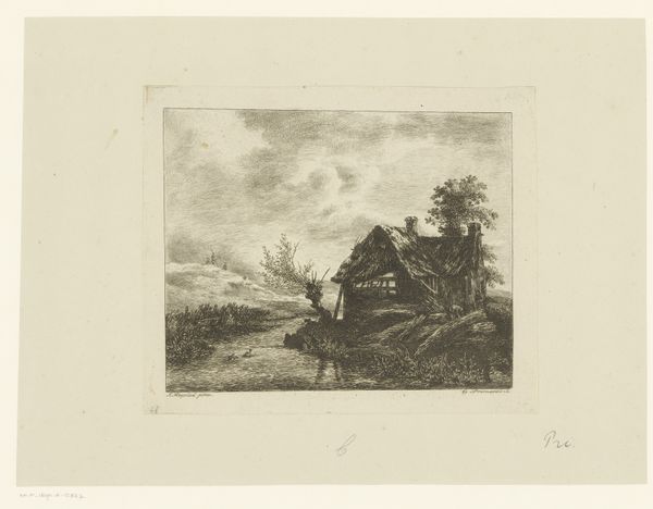 Carel Nicolaas Storm van 's-Gravesande created this landscape with chestnut trees and a barn using etching techniques. Here, the silhouette of trees against the sky evokes a sense of nature's sublime power. The simple barn carries a potent symbolism, echoing the ‘rustic simplicity’ motif found throughout art history, from ancient Roman villas to the farmhouses in Dutch Golden Age painting. This harks back to the human longing for a simpler life, away from the complexities of society. We might recall how Virgil idealized rural life as a retreat from civilization's discontents. This archetype resurfaces time and again, subtly shifting to mirror society's changing values and anxieties. Notice the emotional weight that the setting sun lends to the scene; it stirs a deeply rooted sense of nostalgia. In this way, the artist taps into our collective memory, a realm where symbols evolve.