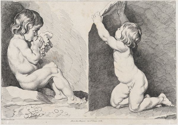 Editor: This engraving, "Amor og Bakkus," created between 1826 and 1893 by H. C. Henneberg, depicts Cupid and Bacchus together, but there's a peculiar vulnerability to the figures despite the allegorical themes, what historical context informs this unusual scene? Curator: Seeing Amor and Bacchus together suggests a commentary on societal pleasures. Note the sharp lines typical of engravings - these weren't easily reproducible for the wider public initially, making the consumption of its imagery quite elite. The rise of romanticism contributed to sentimental artistic style that influenced socio-political attitudes. Who has access to idealized scenes and how might they react to the subjects portrayed? Editor: That’s fascinating. I didn’t think about the limited access. So the sentimental style had a political impact as well? Curator: Absolutely. The Romantics pushed back against Enlightenment rationalism with emotional expression. Now consider how art academies and galleries determined what stories like these should be visually celebrated or criticized. How might these two forces together determine an artists recognition in a time period? Editor: So this work, through its themes of love and wine, as well as being a print of Romantic style, participates in broader social conversations through institutions. That definitely shifts my understanding of it. Thank you! Curator: Precisely! By understanding those broader networks we may find some surprising nuances within those lines.
