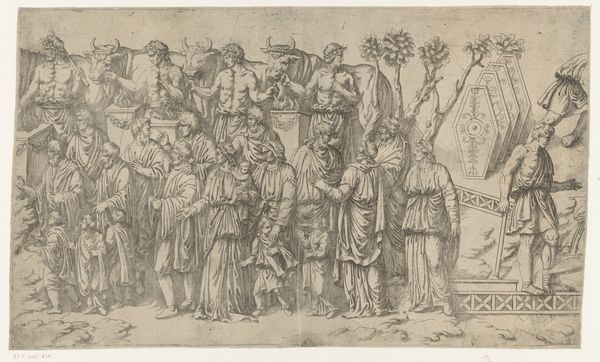Curator: Look at this intriguing ink drawing by Augustinus Terwesten (I), dating back to 1677, housed here at the Rijksmuseum. It’s entitled "Relief with Marcus Aurelius and the Conquered Barbarians." Editor: It feels immediate. Raw. Almost like catching a glimpse of history unfolding in real time. The monochromatic palette gives it a certain weight. Curator: Exactly. The drawing style aligns with the Baroque era, focusing on classical realism. We see Marcus Aurelius mounted on horseback, surrounded by soldiers, and, as the title suggests, defeated barbarians. Consider the context: The Baroque period often celebrated power and order. This piece functions almost as a record of power. Editor: Right, and I’m drawn to the use of ink. Its availability meant art was accessible. This accessibility opens up some compelling ideas: Who were the consumers of art like this? Who made it possible? The creation of the artwork depended on more than just artistic talent. Curator: An interesting perspective. The distribution network, artistic patronage; these all determine who can be immortalized through imagery. The social framework allowed someone like Marcus Aurelius to sit as the subject of the artwork. It emphasizes the connection between images and sociopolitical hierarchies of the period. Editor: And consider the artist's own socio-economic position. This piece had a utilitarian purpose for the art maker. Curator: Terwesten's piece acts as an accessible snapshot of historical ideology. I find the intersection of classical themes filtered through the Baroque lens truly fascinating. Editor: Absolutely, thinking about production and materials allows us to dig a bit deeper, and your historic point adds a crucial layer of depth to understanding the piece's creation and role in society. It serves as a strong reminder to ask about art history as more than an aesthetic practice. Curator: Precisely, this work offers multiple access points for analyzing historical ideas through imagery.