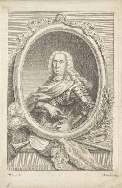 Pieter Tanjé created this print of Jan van Borssele van der Hooge sometime in the 18th century. It is a finely detailed engraving, likely intended to circulate among a relatively wealthy and educated elite in the Netherlands. Looking at the work, we see a man of status, indicated by his elaborate wig, fine clothing, and confident pose. Van Borssele’s armor, combined with the family crest in the background, evokes a sense of lineage and authority, pointing towards a culture that valued inherited status. The Dutch Republic, at this time, was a major center of global trade, and portraits like these reinforced the power and prestige of its ruling classes. To understand this image, we have to look at the structures of power and representation in 18th century Netherlands, and the ways that institutions like portraiture were used to communicate social status. Investigating family histories and archival documents would help us to understand the world in which this portrait was created and consumed.