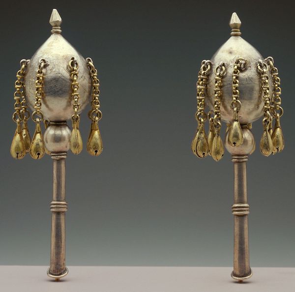 Editor: Here we have a pair of Torah finials, rimonim, crafted in 1895. They reside here at the Metropolitan Museum of Art, and they’re made of silver. Their forms strike me as rather stately, each balancing delicate filigree with rigid geometric shapes. What are your initial observations? Curator: Visually, one is immediately drawn to the interplay of surface textures and the deployment of ornament. Notice how the smooth, unadorned cylindrical shafts contrast with the intricate chasing and piercing on the domed canopies. What effect does that juxtaposition achieve, do you think? Editor: It emphasizes the volume of the finials, that contrasting, plain stem almost seems to amplify the richness in the upper section. Curator: Precisely. Moreover, consider the chains suspending delicate spherical bells; their placement around the central text panels introduces a rhythmic element, both visually and, presumably, aurally, as they would have chimed during ritual procession. Note also the layering: Dome, frame, inscription panel, pendants. Does this structural repetition point you towards a particular artistic intention? Editor: Maybe to signify both an aesthetic intention, and symbolic value within a sacred context? The layering creates order, which feels key to formalism here. Curator: Precisely, The artist creates that order through texture, shape and ornament. A close consideration of the Torah finials emphasizes formalism elements within what seems, at first glance, a merely decorative object. Editor: Absolutely. I had only noticed the ornamentation before, but now I recognize these structural principles at play, and that's something I really value about art! Curator: Indeed, appreciating such structure can allow a work's complexity to really resonate!