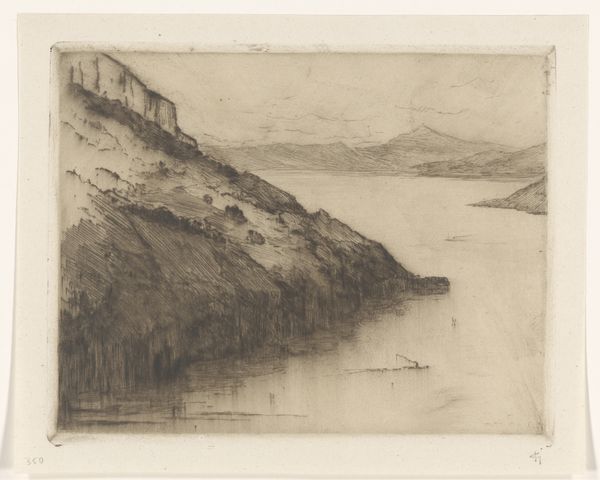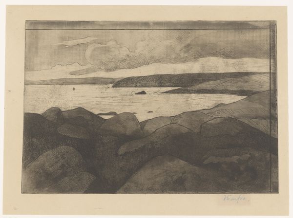 Carel Nicolaas Storm van 's-Gravesande created this etching, "Landschap in maanlicht bij Villa Caprera," using lines and shading to create a powerful, atmospheric image. The composition is dominated by horizontal planes, layering the land, water, and sky. This arrangement provides a structural foundation for the print’s formal exploration of light and shadow. Notice how the moon, a pale disc, casts its reflection on the water, creating a visual pathway that leads the eye from the foreground to the horizon. The dark, dense strokes used to depict the landscape contrast sharply with the lighter, more delicate lines of the sky, creating depth. The artist’s command of the etching technique allows him to engage with ideas around perception and representation. The print destabilizes fixed categories, suggesting an openness to ongoing interpretation.