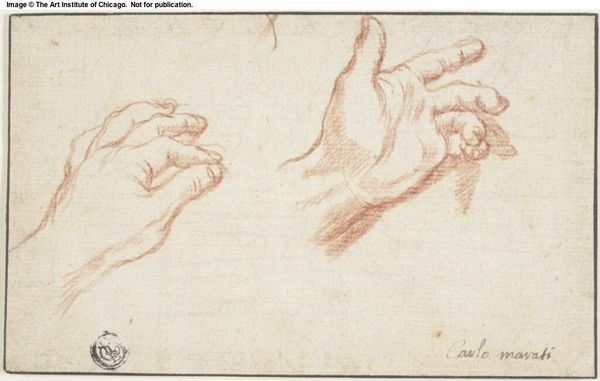 This drawing of two hands was made by Eustache Lesueur, probably in the mid-17th century, using black chalk heightened with white, on grey paper. A drawing like this really puts the making of an artwork in the spotlight. Lesueur’s choice of chalk is interesting. It's a relatively direct medium, meaning there's not much between the artist's hand and the mark made on the paper. You can see the texture of the chalk strokes, and the way he's layered them to build up tone and volume. The grey paper acts as a middle ground, allowing him to create highlights with white chalk. Looking at this study, we might also reflect on what these hands were for. Lesueur would have spent countless hours honing his skill, each drawing a form of labor in itself, with the aim of producing exquisite art. A drawing like this highlights the relationship between skilled handwork and artistic vision. It reminds us that art is not just about ideas, but also about the physical process of making.