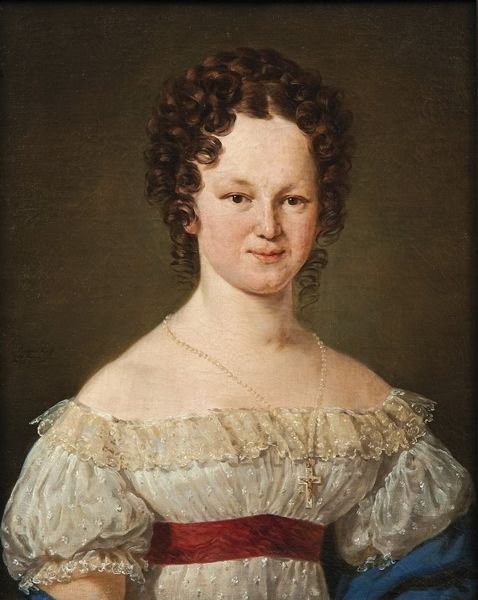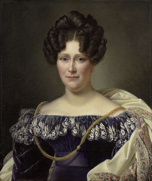 Editor: This is Christiaan Julius Lodewijk Portman’s “Portrait of Maria Christina Nijssen, Wife of Anthonie van der Hout,” painted in 1826 using oil. I’m struck by how the artist captures a sense of restrained elegance. What compositional elements stand out to you? Curator: The subdued palette immediately demands attention. Note the dark background against which the subject emerges, a common technique to emphasize form. Consider the geometry—the severe verticality contrasts with the soft curves of her ruffled collar and delicate ringlets. Do you see how the eye is directed? Editor: I notice that her gaze is directed off to the side. How does that choice affect how we see her? Curator: Precisely! The averted gaze disrupts direct engagement, fostering intrigue rather than confrontation. Further, her formal pose emphasizes a rigid structure that hints at societal constraint, but her gently clasped hands inject some naturalness into this composure. The textures, such as the smooth dress and the delicate lace, each signal different levels of artistic dexterity and meaning, don’t you think? Editor: Definitely. The contrasting textures really do add a sense of depth and realism to the portrait. It's more than just a likeness; it's a presentation of status and personality intertwined. Curator: Agreed. What the painting reveals in its very construction offers a glimpse into more than meets the eye. Editor: It’s amazing how much you can understand just by looking at these formal aspects. Thanks for sharing your insights!