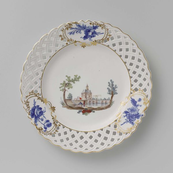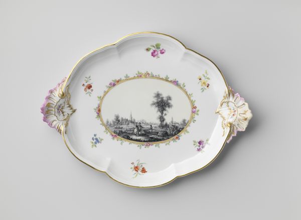 Curator: Here we have a striking example of late 18th-century decorative art: a tureen and stand, crafted around 1778 in Doornik, currently held in the Rijksmuseum. The piece masterfully combines ceramic and drawing mediums. Editor: My first thought is that it’s like a peaceful dream. The blue and white color palette with touches of gold create a soothing scene that simultaneously feels elegant and grounded. There’s something comforting about seeing the landscape in the center and floral ornaments combined together. Curator: The composition reflects the Rococo style of the period. What's truly compelling here is the juxtaposition of high art form with everyday function. Fine porcelain was becoming increasingly available at the time, trickling down into society’s upper middle class. The transfer printing shows the influence of print culture on the decorative arts. Editor: Exactly! And think about how this object, ostensibly designed for serving food, becomes a space to explore landscape and floral decoration. In its own way, this speaks to the democratizing of aesthetics. Also, it evokes complex notions of class. In some circles, even if the object was accessible, the idea of refined social rituals could feel exclusive to those on the outside. Curator: The use of imagery also reflects certain power dynamics. Depictions of landscapes – even imagined ones – were frequently deployed by landowners and other dominant social groups to express dominion and project a sense of place. These pastoral scenes were sometimes a fantasy detached from the socio-economic realities for most. Editor: That’s such a crucial point. While this stand offers a seemingly innocent image, we can ask ourselves, who exactly benefits from it and who might be missing? Did its owners understand or care about their implication within broader structures of wealth and social dominance? Curator: Thinking about the object within the collection of the Rijksmuseum also shifts the context. As an emblem of the Netherlands’ artistic legacy, the piece can contribute to contemporary discourses surrounding identity and the meaning of culture within museum spaces. Editor: Precisely! A once privately-owned item now accessible for everyone to see, to learn from. I now perceive the ceramic stand as a canvas for conversation, stirring ideas related to social identity, and the dynamics of belonging.