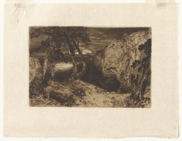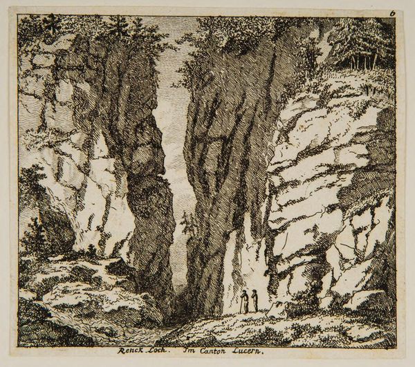 Curator: Salomon Gessner, born in 1730, created this etching, "Wildkirchli and Saint Michael's Chapel," capturing a Swiss landscape. It's now housed at the Harvard Art Museums. Editor: My first thought? It feels like a stage set for a really contemplative play, all cliffs and hidden chapels. Curator: The Wildkirchli caves were significant pilgrimage sites, reflecting the intersection of faith and nature, and Gessner aimed to capture the sublime quality of the Alps, popular at the time. Editor: You can feel the weight of the rock. Even with the delicate lines, there's this sense of permanence, you know? Like those little chapels have always been there, nestled in the mountain's embrace. Curator: Gessner's work circulated widely, shaping perceptions of the Alps and contributing to emerging concepts of national identity. Editor: It reminds me that even the most imposing landscapes can harbor these tiny pockets of humanity, these places for quiet reflection. It’s quite humbling.