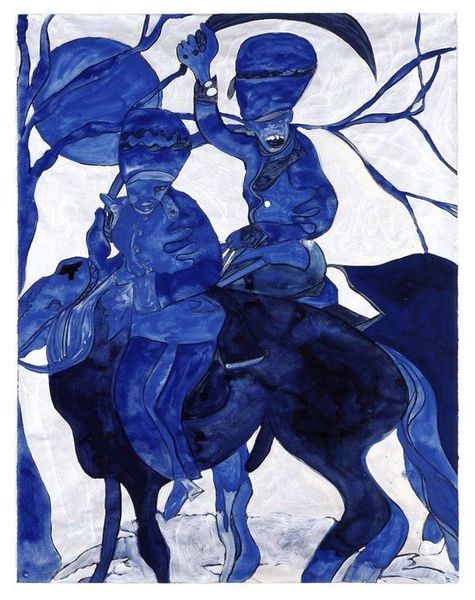Chris Ofili painted Christmas Eve (flight) using oil on canvas. The flatness of the oil paint lends a dreamlike quality to the scene. The paint is applied in broad strokes, reminiscent of classic easel painting. Ofili's decision to use traditional oil paint connects this piece to a lineage of European fine art. Yet, the subject matter of this painting challenges the traditional art historical canon. The figures appear abstracted, almost silhouetted, their skin rendered in stark contrasts. There's a raw, primal energy to this work. By embracing the materiality of oil paint and applying it to subjects outside the European tradition, Ofili blurs the line between the old and the new, the familiar and the strange. It reminds us that materials and making are never neutral; they always carry cultural significance.