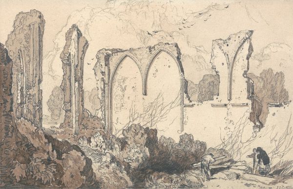 Editor: This watercolor by John Sell Cotman captures the ruins of Llanthony Abbey. The arches create such a strong, almost haunting, sense of depth. What do you see in this piece? Curator: I see a commentary on power structures and the transience of institutions. Cotman, working during a period of immense social upheaval, seems to be depicting not just the ruin of a building, but the crumbling of societal norms. Editor: Oh, that’s interesting! The crumbling of societal norms. Curator: Yes, ask yourself, what does it mean to depict a religious structure in decay? Is it simply aesthetic, or does it speak to larger shifts in faith, politics, and social order? Editor: I never considered it from that point of view. Thanks for the new perspective. Curator: Of course. Always think about the context surrounding the creation of art.