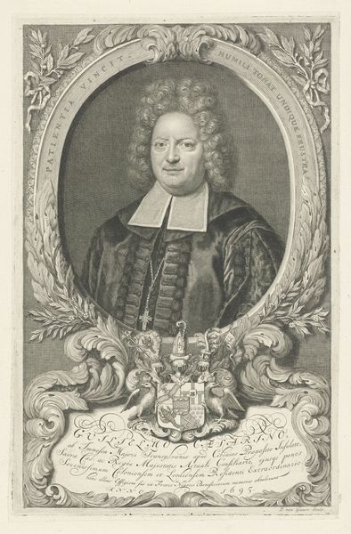 Editor: This is a 1739 print, an engraving actually, by Johann Martin Bernigeroth. It’s titled "Portret van Johann Christoph Gottsched." The details in the Baroque-style frame are exquisite, creating a sense of formality around the subject. What strikes you most about the visual structure of this piece? Curator: The emphasis on line is paramount. Bernigeroth’s control over the burin allowed for remarkable gradations of tone, building form almost sculpturally. Notice how the parallel hatching creates both volume and texture, especially in the rendering of the wig and the intricate fabric of Gottsched's robe. Consider, too, the relationship between the framed image and the larger composition, the interplay between rectangles lending a sense of ordered containment. How does the inscription contribute, visually, to this overall sense of structure? Editor: I hadn't considered that! It provides another structured layer within the frame, balancing the portrait. Is it significant that he’s presented as contained and ordered? Curator: Indeed. While biographical context may inform, let us focus on the visual presentation. The artist meticulously controls the visual field, channeling attention to the subject. Observe the use of symmetry; Gottsched is positioned centrally, and the framing devices reinforce a sense of balance. These choices are deliberately deployed to convey stability and intellectual authority, reflecting a hierarchical worldview embedded in the very fabric of the artwork. Do you notice the small coat-of-arms? What could it convey? Editor: I do, now that you point it out. I suppose it's another marker of status. It's all so carefully constructed, as if every element were chosen to emphasize his position. Curator: Precisely. By attending to the artist's careful arrangement of line, form, and framing devices, we discern the very structure of power itself embodied in this formal portrait. Editor: This has really opened my eyes to how much the visual structure communicates on its own, without needing to know any external information. I'll definitely pay more attention to those details now. Curator: A rewarding observation; my pleasure.
