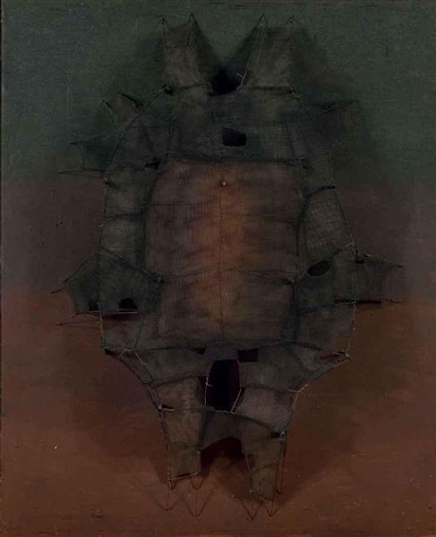 Curator: I'm immediately struck by how dreamlike it feels, like something glimpsed from the corner of my eye just before waking. There’s this incredible density to it, even though it’s an "Untitled" work. Editor: This untitled oil painting is attributed to Zdzisław Beksiński. And yes, density is the word! It seems saturated with unspoken narratives, very typical of Beksiński’s work which is filled with symbolism and allegory. Curator: The figure seems to be emerging, or maybe dissolving, into this textured plane. Look at the wings—they are less feathered than structured. I get the sense of fossilized angels... Or demons? I can't decide! It feels incredibly melancholic, too, doesn't it? Like staring at a lost memory. Editor: Absolutely. Think about Beksiński's personal life; the tragic loss of his wife and son clearly marked his art. But beyond that, there’s a deeper conversation here about power structures—consider these "wings." They’re not lifting this figure up; rather they imprison or distort the figure's very being. The abstraction only intensifies these ideas. Curator: Hmm, interesting, it seems that you see social commentary everywhere you look... Personally, it hits me on a different plane. The palette and brushwork evoke an internal landscape. Perhaps it suggests something primal in the way we perceive our bodies? Aren’t we all sort of just fossilized beings pretending to be more? Editor: Well, art doesn’t exist in a vacuum! And in thinking of matter painting as a vehicle for communicating, and maybe even critiquing how bodies, especially marginalized ones, exist within social frameworks, we come a step closer to understanding abstraction’s critical role. I think he asks a crucial question of us. Is it really freedom if our bodies, too, remain colonized? Curator: Well said. Despite my more sensory impression of it, I recognize that tension you mentioned— the discomfort it evokes isn’t just visual. Thanks to your perspectives, I understand that his work isn’t so free from any societal reference point. Editor: And thanks to you, I can access more the intuitive dimension within it. These works are dense enough to take multiple routes through them anyway, aren’t they?