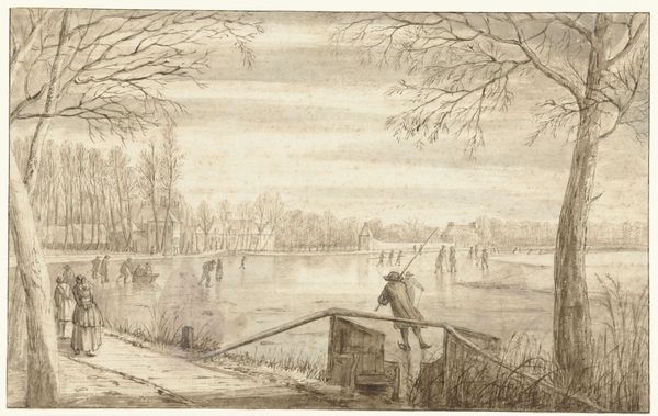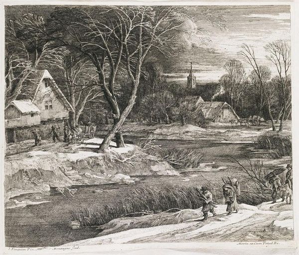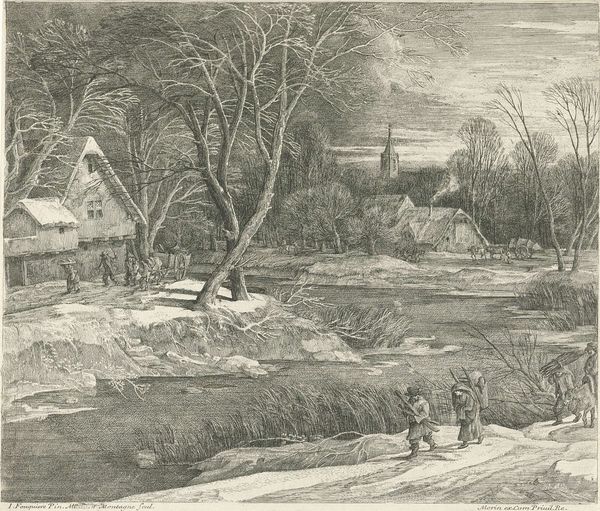 Curator: Brrr, I can almost feel the chill emanating from George Baxter's "Winter," held here at the Harvard Art Museums. Painted in the mid-19th century, it captures a stark, snow-covered landscape. Editor: It feels like the quiet before a storm, doesn’t it? The muted palette almost washes out the scene, lending it a ghostly quality. Curator: The composition certainly emphasizes the geometry. Note how the bare trees and the church spire create strong vertical lines, contrasted by the horizontal snow-laden roofs and the log in the foreground. The figures are rendered in a slightly different way, creating almost a collage. Editor: They're like afterthoughts. I'm drawn to the atmospheric perspective, though. It's a masterful execution, dissolving details into the distance and enhancing the sense of vastness and maybe even foreboding. The pink sky hints at some hidden heat. Curator: Yes, the subtle gradation of color contributes to the overall mood. The tonal range is quite narrow, heightening the textural contrast between the snow and the sky. It's a wonderful formal study of the season. Editor: And a lovely reminder that even in the depths of winter, there is a stark beauty to be found.