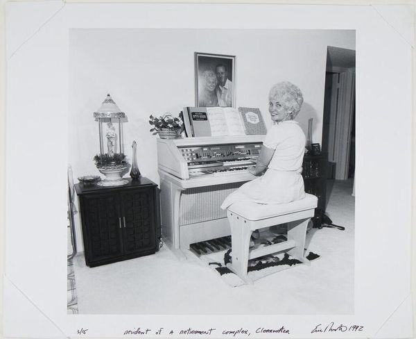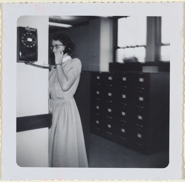 Editor: Here we have Joan Greco’s "T.L.C. File Room," a black and white photograph from 1956. The woman has a calm yet serious expression as she's working. What kind of symbolism can we find here, portraying this worker in her time? Curator: This photograph presents a fascinating intersection of personal and institutional identity. Consider "T.L.C." – what emotional weight does that abbreviation carry when juxtaposed with the sterile, almost impersonal environment? What does T.L.C stand for in this case and is the title implying that there is or isn’t tender loving care present? Editor: That's a good question. I’m not sure! It’s interesting how you focus on the title, too. It seems almost ironic given the rigid, bureaucratic setting. Is there a kind of subtle commentary on the nature of work itself at play? Curator: Precisely! Look at her posture, the arrangement of the machinery around her. The keys, reminiscent of a piano, suggest a performance of labor. Does the image evoke feelings of efficiency or a kind of cold detachment? Does the office look busy to you? Editor: There is a kind of melancholic quiet to it all. The symmetry with the wall, too! The blank space is heavy in its own way. Curator: The negative space contributes to a sense of isolation. That visual emptiness surrounding Joan serves to amplify her presence while also suggesting a feeling of confinement, or perhaps…duty? What might the symbols embedded within these feelings reveal about societal expectations in the 1950s? Editor: Wow, I hadn't thought about it that deeply. So, through these visual cues, we glimpse not only a woman at work but also a reflection of her era's values and constraints? Curator: Indeed. It's through these symbolic layers that we access a richer understanding of both the artwork and the culture from which it emerged. Editor: Thanks, that perspective shifts my whole understanding of the piece.