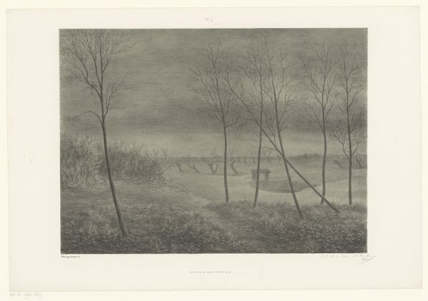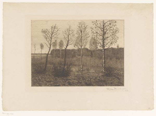 Simon Moulijn created this artwork, 'Trees by the Water', using etching. The rhythmic arrangement of trees here resonates deeply within the collective psyche, invoking the primal symbolism of the forest. The trees, with their slender trunks reaching skyward, echo ancient depictions of sacred groves, places of spiritual communion and refuge. This imagery stirs the emotional depths and harks back to the Romantic movement’s fascination with nature. We can see it repeated throughout history, from Dutch Golden Age landscapes to German Romantic paintings. The forest becomes a mirror reflecting our own inner wilderness. This connection is not merely aesthetic; it is rooted in our shared human experience. The forest symbolizes the subconscious, a place of mystery and transformation. The emotional power of this image, therefore, lies in its ability to tap into the deep, often unspoken, connection we feel towards the natural world.