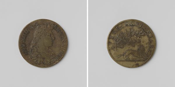 This gilded medal, commemorating the naval battle of La Hogue, presents a fascinating study in miniature relief. Its circular form, a self-contained world, is divided into two distinct yet interconnected sides. One side depicts a profile portrait, framed by text that curves around the circumference. The other features a complex scene, likely representing the battle itself, with ships and perhaps symbolic figures rendered in incredibly fine detail. The artist, F. de Winter, uses the limited space to create depth through layering and varying the height of the relief. The choice of gold as a medium adds to the medal’s intrinsic value, both as a historical record and an object of art. Gold, traditionally linked with triumph, reflects and reinforces the event’s significance. The circular format contributes to the coin's inherent functionality and also implies the cyclical nature of history. The medal operates as a sign, encoding the political and martial accomplishment within a compact, enduring form.