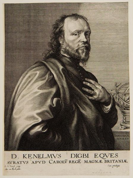 Editor: So this is Robert van Voerst's "Portrait of Kenelm Digby," made sometime between 1627 and 1636. It's an engraving. I’m struck by how the detailed lines create a real sense of texture, particularly in the hair and the draped fabric. How would you approach an interpretation of this piece? Curator: I find the structural balance of this portrait particularly compelling. Notice how the figure’s pose, slightly off-center, is counterweighted by the armillary sphere. The visual contrast between the textures—the softness of the robe versus the metallic hardness of the sphere—creates a satisfying tension. Editor: The sphere does draw the eye. It’s also carefully detailed! Curator: Indeed. Consider the strategic use of light and shadow. The artist employs a sophisticated hatching technique to sculpt the forms, giving them a tangible presence. What’s your perspective on the direction of the gaze? Editor: It is directed at the viewer. I read that direct gaze, combined with his hand placed on his chest, as assertive. Do you agree that they express certain personality traits? Curator: I appreciate your observation; however, I see how it functions formally within the portrait’s design. The line of sight creates a vector, pulling the viewer into the composition, fostering a connection. Furthermore, the subtle gradations achieved in this engraving medium elevate it above simple likeness and enter the realm of formal beauty. Editor: I never considered his gaze that way. I was too caught up in looking for an emotion. I see now that all those lines build into form. Curator: Exactly. Each element, when viewed structurally, contributes to a harmonious whole. An instructive and carefully crafted piece overall!