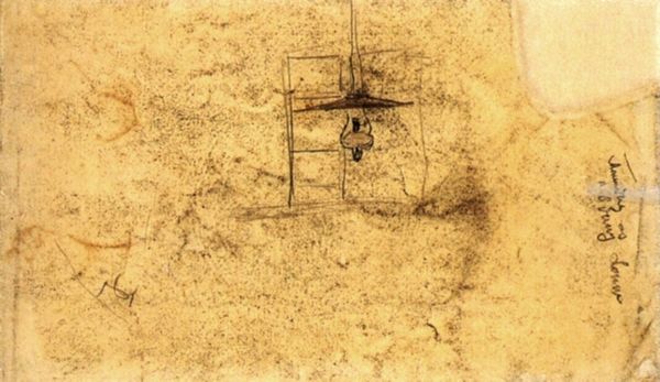 Egon Schiele made this wonky ladder out of what looks like black ink on a thin, tea-stained paper. The ladder's got this beautiful, almost clumsy energy, like it's been through a lot, but is still hanging on. I love the way Schiele doesn't try to hide the imperfections; you can see the texture of the paper, the way the ink bleeds a little. The black outline isn’t precise. It's honest, you know? Like he’s saying, "Here it is, take it or leave it." There’s a little splotch of orange on the left, like a little accident that works. And that ladder, bent as it is, still feels like it wants to reach somewhere. Maybe Schiele is thinking about Vincent van Gogh and his Potato Eaters or Old Man in Sorrow; these artists speak to each other across time, questioning, reaching, and never quite arriving.