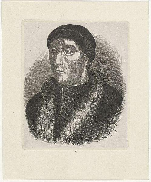 Francesco Bartolozzi created this print of Archbishop Warham, sometime before his death in 1815, using engraving and etching techniques. Warham occupied a position of considerable power and influence within the church and state during the reign of King Henry VIII, a time marked by significant political and religious upheaval. Bartolozzi's print offers insight into the visual representation of power and masculinity during the 18th century. The Archbishop’s gaze holds a sense of authority, while the luxurious fur collar speaks to the sitter's status and wealth. It would be interesting to consider the emotional implications of portraying individuals who played roles in the social and political structures of their time. This print not only preserves the likeness of a historical figure but also invites us to reflect on the ways in which identity, power, and representation intersect within historical portraiture.