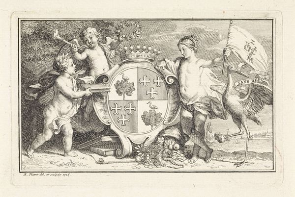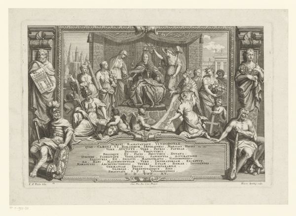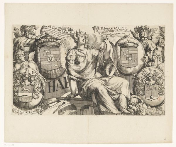 Editor: Here we have "Allegorie op de meerderjarigheid van Willem V," or "Allegory on the Majority of William V," an engraving from 1766 by Cornelis van Noorde, held at the Rijksmuseum. It's packed with symbolism, a real historical snapshot. It almost feels…staged, a bit like a political poster, but done with incredible detail. What stands out to you about it? Curator: Staged, yes! Like history trying on its best clothes. It’s a performance of power, isn't it? Look at the central shield, surrounded by those allegorical figures – Wisdom on one side, Commerce or Naval Power, perhaps, on the other. It feels like a who's who of virtues, all vying for William's attention on his big day. That angel, too, blasting a fanfare – did he need to announce something so obvious? It's all a bit extra, and so very Baroque! What do you make of the lion? Editor: The lion? He looks a bit...bored, actually. Like he's been doing this whole "symbol of strength" thing for centuries and could really use a nap. Curator: Precisely! That lion, weighed down by centuries of expectations. Perhaps Van Noorde is hinting at the burden of leadership as much as the glory? What’s the narrative, beyond the fanfare? And that bookshelf, what kind of statement it’s making, with the crown, ships and weapons depicted with each other. Editor: It never occurred to me to think about burdens, seeing an allegory as simply just celebratory. Maybe that angel blowing the trumpet is overcompensating to distract us from what it actually means to carry such a burden, haha. Curator: Haha, yes, what's behind that blowing the trumpet? Perhaps the key to looking beyond pure iconography resides precisely in thinking about all those “obvious” elements anew, as prompts for different narratives, or deeper ones, that bring old, staged, frozen imagery back to life.