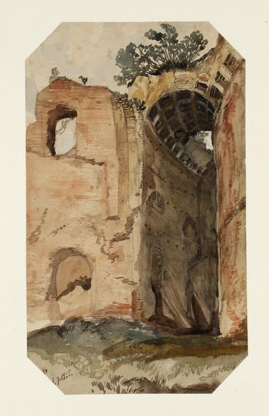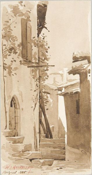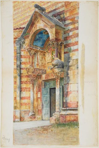 Editor: This watercolor, "Late Gothic Doorway, Venice," by Charles Herbert, is intriguing. The peeling plaster next to the detailed doorway makes me wonder about the labor that went into its creation versus its current state. What stands out to you? Curator: The juxtaposition you noted is key. Consider the economic forces that shaped Venice, and how they’re reflected in the materials. The doorway speaks of wealth, doesn’t it? Editor: Absolutely, but then the decaying walls show a shift. Curator: Precisely! And watercolor as a medium – was it chosen for its speed, its portability, for capturing a fleeting moment in this economic shift? It is quite thought provoking. Editor: That gives me a lot to consider about process and social commentary. Thanks! Curator: Indeed, materiality always tells a story.