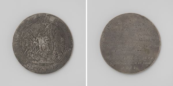 This silver medal commemorates the twenty-fifth wedding anniversary of Sijmon Ooms and Geertje Blok. The piece seems to be made by an anonymous artist, sometime in the 1600s. The medal is made from a single piece of silver, carefully engraved on both sides. On one side, we see an engraving of the family’s coat of arms, surrounded by an inscription noting the anniversary. The reverse has an ornate poem in Dutch, dedicated to Cornelia Ooms, likely a relative. These medals were often commissioned by families to mark significant life events, and would have been expensive items. The silversmithing and engraving required a mastery of craft skills, reflecting a high degree of specialization of labor in the early modern period. The artistry and the precious material signifies the family's wealth and social standing, subtly intertwining family history with the economic realities of the time.