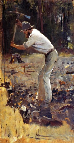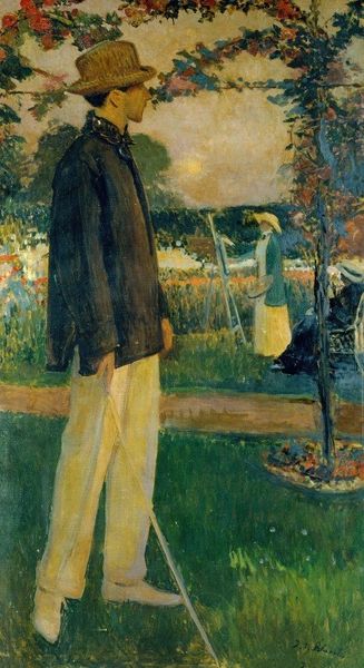 James Jebusa Shannon captured this moment of George Hitchcock working in his garden in Egmond with oil on canvas. Shannon’s application of paint is critical here; the work's material and processes are vital to its appearance. Notice how the brushstrokes, thick and visible, give texture to the scene, almost mimicking the density of the garden itself. The impasto technique, where paint is laid on thickly, adds a tactile quality, bringing the scene to life. This work's social significance lies in its representation of labor; here we see the labor of artistic creation. Hitchcock is not merely observing, but actively engaging with his environment. This depiction challenges the traditional view of artists as detached observers, instead presenting them as workers, immersed in the physical act of creation. Ultimately, understanding the materials and making of this artwork allows us to appreciate the labor involved, blurring the lines between fine art and the everyday act of working.