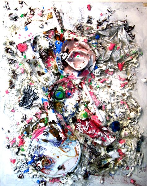 Sandra Chevrier created La Cage et celles de la Lune, and in it we see a single eye, intensely gazing, surrounded by a riot of colors and textures built up around the canvas's edge. The juxtaposition is immediately striking: a smooth, realistic eye set against a heavily textured, almost sculptural border. Chevrier's combination of precise portraiture with an expressionistic, abstract frame invites us to consider how meaning is constructed. The eye, rendered with care, serves as a focal point. However the thick impasto of blues, purples, and whites around it destabilizes any straightforward reading. These materials could signify the barriers or complexities of perception, a frame through which we view the subject. The use of such tactile materiality challenges our expectations of painting. It's not just an image; it's an object, a constructed reality. Chevrier's work here exists in the tension between representation and abstraction. It's a visual and tactile reminder that how we see and what we see are always mediated, never neutral.