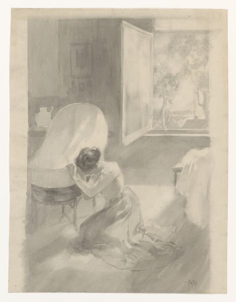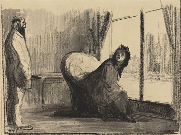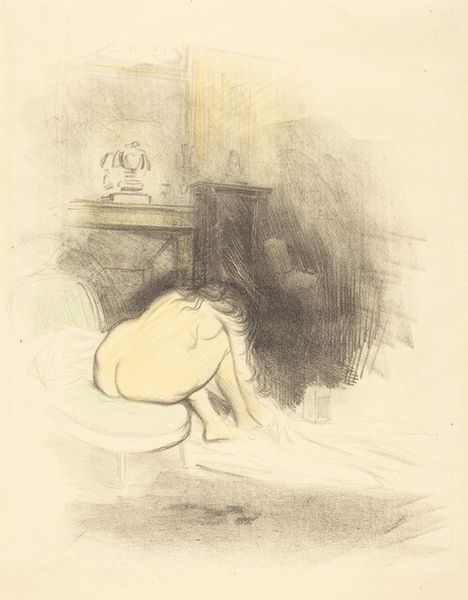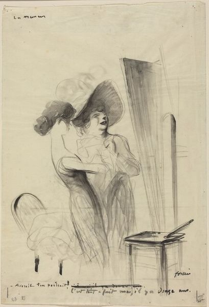 Curator: Here we have Jean-Louis Forain's pencil drawing, titled "Love in Paris." Editor: Right away, the scene has this illicit, almost theatrical, feel. Like we've walked in on something private, even though the style is so understated. It’s a mood, really. Curator: Indeed, the scene exudes a sense of lived reality that’s at once gritty and intimate. Forain often explored themes of modern Parisian life, and this piece reflects that with its sketch-like quality. The woman is adjusting her dress, while the man reclines in bed. It speaks volumes with minimal strokes. Editor: Yes, but look at how Forain handles the light and shadow, particularly the stark contrast on the draped chair in the foreground. He's using a very simple technique, just lines and shading, to direct your eye and add to the secretive air. The vertical lines give the sense of the enclosure. Curator: I agree, the composition cleverly employs both line and shadow to convey meaning. And notice the almost ghostly figure in the framed picture hanging over the man's bed. Is it another suitor? Or merely an allusion to his past? It could mean so much. Editor: It almost hints at something cyclical. Back to my earlier observation of stark light effects—think how daring, to leave so much unsaid and let the viewer complete the story, so the cyclical quality adds a further element of a narrative not being told. Curator: Absolutely! I believe it epitomises Forain's observational skills and storytelling ability. There's a rawness that captures a specific mood in time. Editor: Well said. The sketch almost pulsates with untold narrative and unresolved tensions, which is why the title, "Love in Paris," almost feels ironic, a provocation of sorts, doesn’t it? Curator: That adds an additional layer, no doubt. Editor: Ultimately, what fascinates me about "Love in Paris" is that it can elicit all sorts of feelings from different audiences! Curator: Very true, indeed, it's like capturing a moment, like a thought!