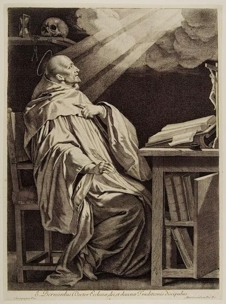 Jean Morin’s engraving portrays Saint Bernard de Clairvaux, a prominent figure in the 12th-century Catholic Church. Morin created this print during the Counter-Reformation, a period marked by the Catholic Church’s efforts to reassert its authority amidst the rise of Protestantism. Here, Bernard is bathed in divine light, an indication of the subject's importance to the church, set against symbols of mortality and the passage of time. Bernard’s contemplative pose reinforces the spiritual devotion that was encouraged during this period. During the Counter-Reformation, the representation of saints served as a powerful tool. This print presents a traditional image that reinforces the established religious doctrine. It is a depiction intended to inspire devotion and reaffirm the spiritual and moral authority of the Catholic Church. The image serves as a reminder of the divine presence in the lives of individuals committed to the church.