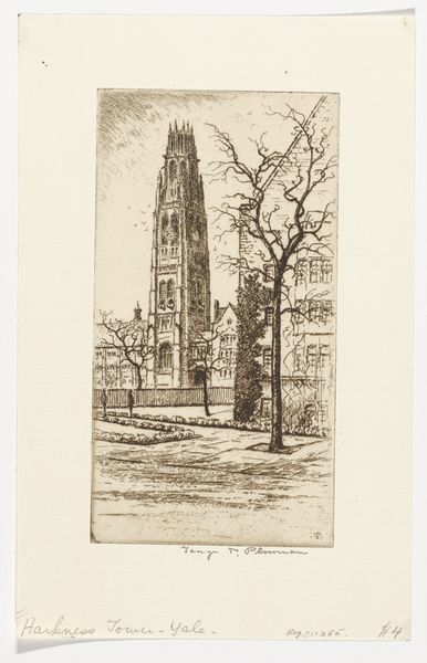 Editor: Here we have Theodore Roussel’s "Winter, A House in Green Park," created between 1890 and 1894 using lithography, etching, and other drawing media on paper. I’m immediately struck by how stark and somewhat bleak it feels, like the bare bones of the city are showing through. What aspects of its historical or social context should we consider when viewing this work? Curator: That bleakness is telling. Consider late 19th-century London. Rapid industrialization led to both unprecedented wealth and extreme poverty, often side by side. Roussel, as an Impressionist, was interested in capturing fleeting moments, but he also lived in a time of immense social upheaval. Editor: So, do you think the subject matter, this imposing house, is a deliberate commentary? Curator: Possibly. The Green Park area was, and still is, quite affluent. Is Roussel subtly highlighting the division between the haves and have-nots by depicting a grand house in the grip of a seemingly desolate winter? What purpose does the inclusion of the bare tree serve, positioned in front of the house, blocking our access? Editor: It definitely adds to that feeling of separation, almost like a barrier. The branches seem to mimic the rigid structure of the building, trapping the house behind a veil. So the "Winter" of the title is less about the season and more about a kind of societal chill? Curator: That's a fascinating way to look at it. Perhaps Roussel isn’t just capturing a season, but reflecting on a specific social climate, using the cityscape as a canvas for commentary. The lack of color, the stark lines – all reinforce a sense of austerity. Consider the politics of imagery in that era. Who was represented and how? Whose stories were told, and whose were ignored? Editor: I never thought of a landscape having that much social weight! It’s fascinating to consider how an image, so seemingly simple, can carry so much historical and social information. Curator: Precisely! Art is always in conversation with its time. It’s our job to listen closely.