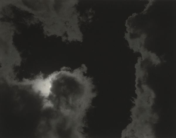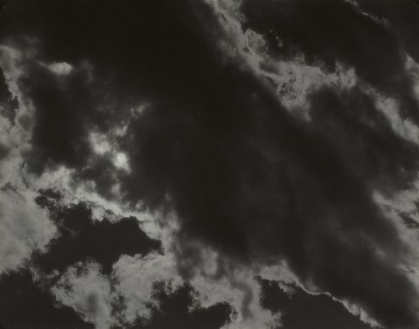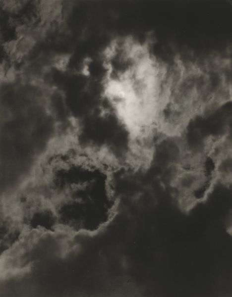 Editor: So here we have "Equivalents", a gelatin-silver print made in 1926 by Alfred Stieglitz. The tones are very striking; almost overwhelmingly dark in the center with the fluffy, bright clouds surrounding it. It gives me a strange sense of… being overwhelmed. What do you see in this piece? Curator: I see a powerful engagement with the industrialization of art, specifically the implications of mass photographic reproduction in the early 20th century. Stieglitz, known for his role in elevating photography to fine art, ironically employs a distinctly *mechanical* process to create deeply expressive work. Consider the labor involved: the darkroom work, the selection of the precise photographic paper, the act of "making" the print itself. This isn't just about capturing a scene, but crafting a tangible object. Editor: That’s interesting! So, the materials themselves, and the act of creation, are what hold the value, despite photography being so easily reproduced? Curator: Precisely! It’s a commentary on how even mass-producible forms of art like photography can embody unique labor and intention. The choice of gelatin silver – a standardized material – speaks to the growing industrialization, while the cloudscape subject pushes against the limitations of the medium, transforming the ordinary into something transcendent. Editor: So it's a physical, almost industrial *object*, imbued with artistic intentionality. He used the existing "factory standard" photographic process of the time, and used it in such a way that a powerful form of abstraction arises. This challenges the idea that art can't be born from a production line. Curator: Exactly. What seems initially like a straightforward landscape actually probes profound questions about labor, material culture, and artistic agency. We’ve been discussing Stieglitz the *producer* and his manipulation of the existing cultural landscape, and can even contrast his work with other mass-produced works of the time. This contextual consideration gives additional insight into why “Equivalents” remains captivating. Editor: I never thought about photography like that before! Seeing it as part of the broader manufacturing boom helps put its artistic intention into perspective. Thanks for the insightful lesson!