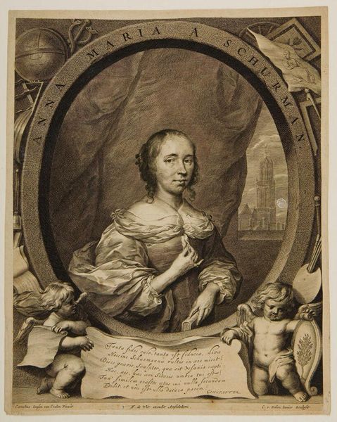 Editor: This is a print of Anna Maria van Schurman by Cornelis van Dalen, the Younger. She looks like such an accomplished woman. What can you tell me about it? Curator: Well, it's important to remember that this portrait exists within a very specific social and intellectual context. Van Schurman was a highly educated woman in the 17th century, which was quite rare. The symbols surrounding her - the globe, the books, the cityscape - speak to her intellectual pursuits and her place within a network of learned individuals. How does the inscription at the bottom speak to you? Editor: It looks like Latin. I wonder what it says about her beliefs. Curator: Exactly. This artwork serves as a powerful visual statement about female intellect and agency during a time when those qualities were often suppressed. This print challenges us to question the historical structures that limited opportunities for women. Editor: It makes you wonder what other women were doing at the time and what their stories were. Curator: Precisely. It prompts us to re-examine history and amplify marginalized voices. Thank you.