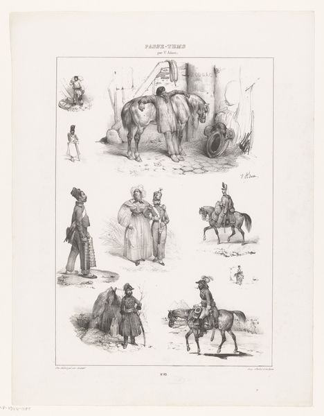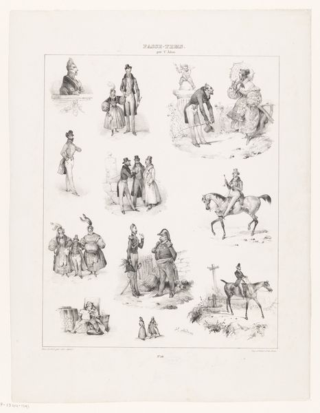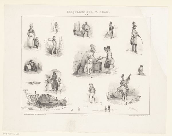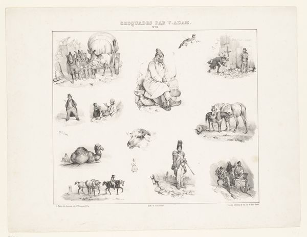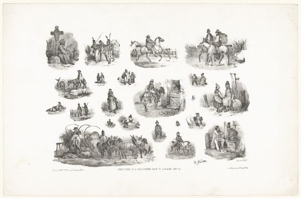 Curator: Before us is a print by Victor Adam titled "Thirteen scenes from daily life with various human figures and horses", dating back to 1833. It’s currently held in the collection of the Rijksmuseum. Editor: My first impression is of a delightful hodgepodge! It feels like stepping into a charming 19th-century storyboard, capturing glimpses of ordinary existence. There's a quaintness to the composition. Curator: It's interesting that you mention a storyboard. Adam was actually quite fascinated by the burgeoning culture surrounding printmaking and affordable reproductions. He experimented a lot with ways to distribute his work to a wider audience than traditional art markets allowed. You could argue, here, that he presents almost a proto-comic strip in a single frame. Editor: Absolutely. And the themes of everyday life invite an analysis of social structure. Observe the figures – the blend of laboring bodies alongside seemingly wealthier, stationary individuals. Do we see hints of social critique embedded within these observations of 19th-century Dutch life? Who is depicted? And, equally importantly, who *isn’t*? Curator: From a material perspective, it’s all about the etching technique that allowed for multiples, for circulation, and ultimately for the construction of a specific kind of visual culture focused on affordability and access. Think about who owned these kinds of prints, versus a unique painting in an aristocratic home. Editor: The act of creating multiple reproductions speaks to accessibility and democratisation of art, something of paramount importance when examining social disparities in class-bound society. And this isn't a neutral act. Who gets to see which images, and where, is crucial to our understanding. Curator: The level of detail Adam achieves using etching techniques is quite stunning, wouldn’t you agree? And the choices about what to represent, in what light, are essential considerations for thinking about his overall intentions as an artist engaging with the rapid social transformations occurring in the 19th Century. Editor: True, and viewed in light of contemporary postcolonial or critical race theory, we could consider to what degree these images are subtly, or not so subtly, involved in shaping perceptions of the "other", of normalcy, and ultimately, the very frameworks of power and social dominance. Curator: An intriguing and crucial aspect to bear in mind, especially given the prevalence of such images in shaping broader societal values at the time. So many layers of material and historical contexts at play in this deceptively straightforward print! Editor: Precisely! It demonstrates just how much these snapshots of seemingly mundane moments can unveil about society when interrogated through the right theoretical lens.