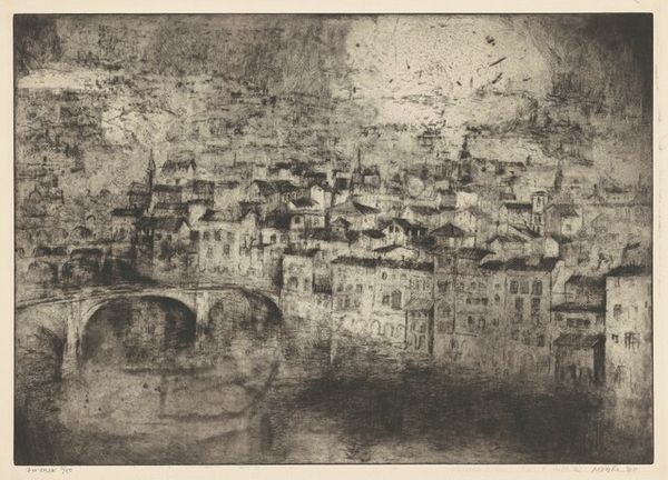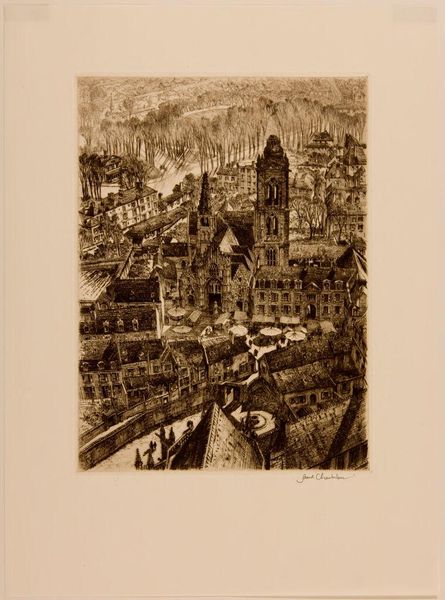 Editor: So, this is Valerie Thornton’s "Amboise." The Tate dates it to no specific year. It's a print, and I’m immediately struck by the density of the composition and the monochromatic palette. What do you see in this piece? Curator: I observe a fascinating interplay between texture and form. Note how the intricate lines and patterns create a sense of depth and volume, even within this limited tonal range. What effect do you think Thornton intended by eschewing a broader spectrum of color? Editor: Perhaps to emphasize the architectural forms themselves, rather than being distracted by coloristic details? Curator: Precisely. The emphasis on line and texture allows us to appreciate the structural complexity of the townscape. Notice how the artist uses hatching and cross-hatching to model the forms and create a sense of light and shadow. A sophisticated understanding of the medium is clear. Editor: I see it now. It is almost like she built the city with lines. I learned a lot! Curator: As did I. This detailed view of Amboise, with its unique compositional structure, is quite compelling.