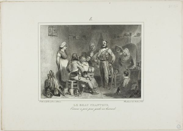 Horace Vernet created "Reine, l'excés des maux où la France est livrée..." as an engraving. This reproductive process made images widely available, tying artistic creation directly to market demand. Engraving demands meticulous labor. The artist uses a tool called a burin to carve lines into a metal plate, inking the plate and pressing it onto paper. The stark contrast between the ink and paper heightens the emotional tension of the scene, emphasizing the subjects' expressions and the heavy atmosphere. Look closely and notice how the artist has deployed the technique to create depth and shadow. This print depicts a queen surrounded by advisors, possibly facing political turmoil. The detailed rendering of costumes and setting indicates the luxury enjoyed by the elite, in sharp contrast to the labour required to produce the print itself. This underscores the complex relationship between art, labor, and social class in 19th-century France. This engraving serves not only as a historical record but also as a commentary on power, production, and consumption.