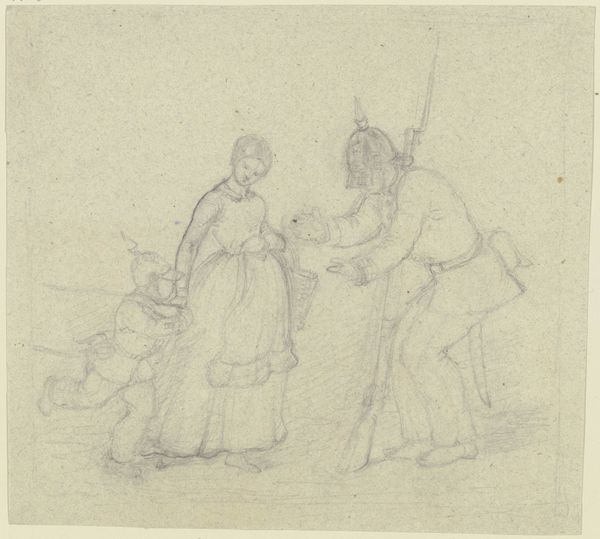Editor: This drawing, titled "Studieblad met vrouwen," or "Study Sheet with Women," was created by Charles Rochussen sometime between 1840 and 1860. It's a pencil sketch on paper and it feels very informal. What can we tell from looking at its material presence? Curator: Well, consider the paper itself. It's a mass-produced ground for studies, decidedly un-precious. Notice the rapid, almost careless application of the pencil. This speaks to the economies of artistic production – time is money, even for studies. It is, though, romantic genre-painting: an image intended to feel effortless and truthful. But can something sketched so hastily tell the truth? Editor: That's a great point! What about the women themselves? The focus is on the dress– so much volume! Curator: Absolutely. Look at how the fabric is rendered: minimal lines but enough to suggest a weightiness and a clear source of light. Rochussen focuses on the materiality of their clothing, likely indicating their social standing and relationship to labor, but the focus of this *Studieblad* isn't these individual woman but the romantic vision of “woman” in toto. It reflects societal perceptions, or expectations of women during that time. What labor went into making the dresses these women are wearing? Who performed that labor, and were their images sketched by Charles Rochussen as well? Editor: So it's not just a study of form, but also a reflection on the socio-economic context of the time? A sort of class document? Curator: Precisely! Rochussen is telling a story through the use of the readily-available, cheap, pencil on mass-produced paper in these forms – reflecting and reinforcing hierarchies in visual culture. Editor: That changes how I see it entirely! I’m starting to see the relationship between material choices and how meaning is made. Thank you!