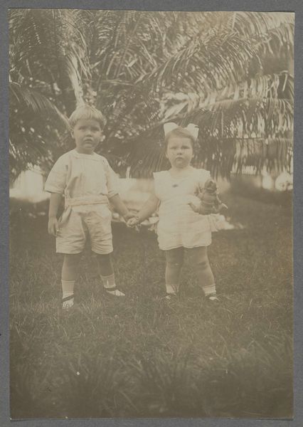 Curator: Here we have "Twee peuters zittend op een doek in de openlucht, waarschijnlijk de tweeling Ad en Johanna van der Kop," taken some time after 1901 by Willem Carel van der Kop. Editor: There’s a tender, somewhat solemn feel to this image. The soft focus and subdued sepia tones lend it a dreamlike quality. It's interesting how the details are captured— the texture of the fabric, the loose stones of the ground— it emphasizes the mundane setting despite the rather adorable subjects. Curator: Yes, and consider the production. Early photographic processes often demanded lengthy exposure times, influencing composition and encouraging stillness. These children are remarkably still for their age. The photograph presents them amidst simple props—a blanket, a small plant, some cloth toys. These were the materials immediately available, chosen perhaps for their textural interest or ease of procurement. It speaks to a specific economy of means. Editor: Beyond the immediate, though, look at the plant in the background, the texture in the ground, those neutral props. Everything anchors to the simple life. There's also the children themselves: The twin toddlers create an unavoidable doubling effect, resonating with themes of innocence, vulnerability, but also mirroring and identity. Curator: Indeed. What fascinates me is the level of craft inherent in early photography. We often frame photography as purely representational, but images like this, which likely come from the artist’s family archive, underscore the constructed nature of the medium. This isn’t a snapshot. Time and deliberation must have been dedicated to producing the print; to arranging the children, setting the light... it suggests both the preciousness of labor but also perhaps some family resources at disposal. Editor: The sepia tone, a consequence of the chemical processes involved, also carries a nostalgic weight. It triggers our associations with historical memory, imbuing the image with a sense of timelessness and connecting us to a specific cultural and artistic movement in portraiture and familial memory. The two sitting under a house plant evokes a primal scene, reminiscent of the garden of eden and first innocence of the twins. Curator: I agree. Analyzing the photo through this lens grants new perspectives. This wasn't simply documentation, but a crafted image of carefully considered objects, materials, and individuals produced with some skill. Editor: Absolutely. By paying close attention to visual cues and emotional responses, we can extract greater cultural resonance and expand our understanding of what these kinds of artworks really do mean.