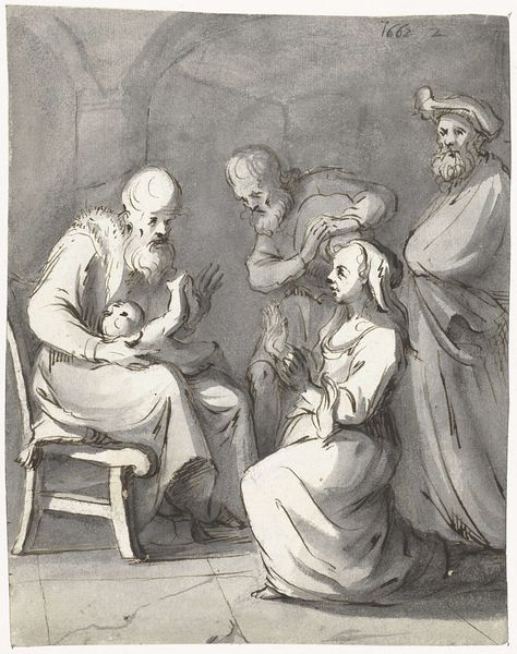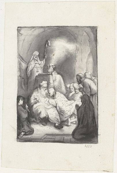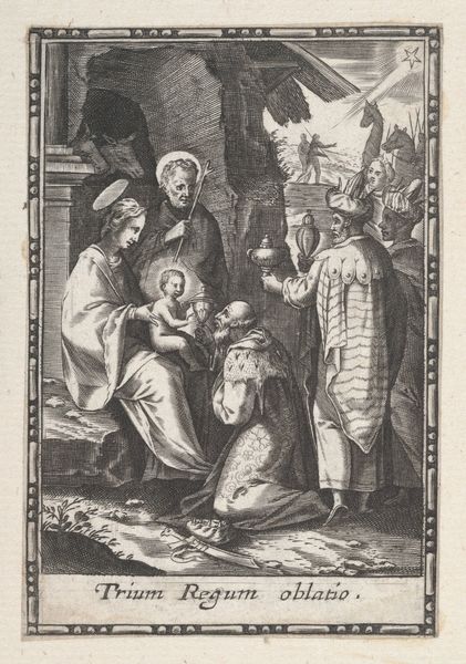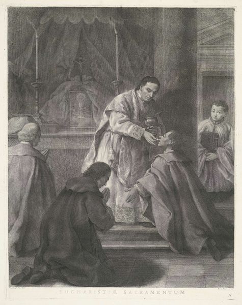 Curator: Ah, yes. Here we have "Het sacrament van het huwelijk," or "The Sacrament of Marriage," an engraving made by Giovanni Marco Pitteri sometime between 1712 and 1786. Editor: Immediately, I’m struck by how meticulously detailed this print is. The engraver really captures the textures of the clothing, especially that elaborate gown. I am thinking about all the time involved to make this piece. Curator: And rightly so! These kinds of engravings were important documents of social ritual. Think about how this print visualizes and therefore disseminates specific ideals about family, religion, and societal order. The solemnity, the placement of figures… it all reinforces marriage as a cornerstone of 18th-century European society. Editor: The social and political forces in this piece are all intertwined. Engraving had specific material and social applications, producing something reproducible for the wider populace that was originally only accessible through paintings owned by elites. I also note the presence of children. We often ignore labor when looking at historical work; what labor would the offspring provide, within this burgeoning sacramental, marital system? Curator: Precisely. And look at the architectural elements suggested in the background, those massive pillars. It emphasizes the weight of the institution. And how this religious event impacts personal status and is intertwined with the infrastructure surrounding that moment. Editor: Do you find that emphasis to be overwhelming? Despite the focus on fine details and their intended roles in their setting, it still lacks emotional depth. The lines and their labor feel stiff and calculated. Curator: Perhaps that’s because it is not meant to be a raw, emotional portrait, but an idealized vision, a projection of desired social cohesion through marital structures. Editor: In any case, I'm just captivated by the labor in these baroque forms. Considering their long lives beyond just being reproduced at a singular time. Curator: Well, by analyzing this engraving, its details and what its symbolism transmits about social power, hopefully our listeners have gained a better sense of the political project behind even seemingly quiet domestic scenes of that era.