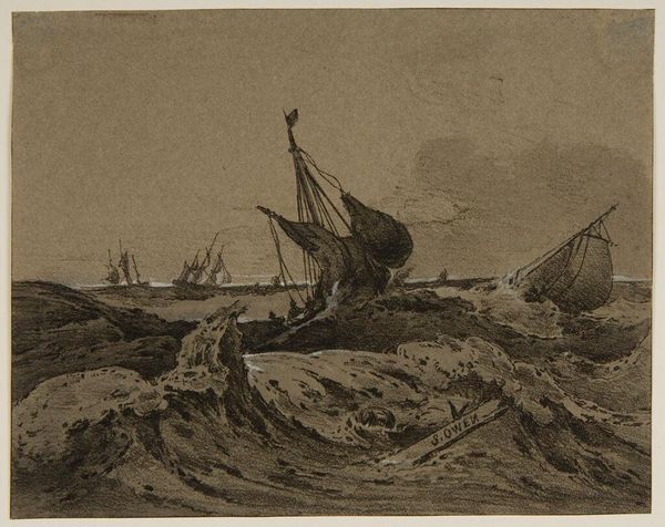 Curator: Here we see Samuel Prout's "Weymouth Castle, Dorsetshire," part of the Tate collection. It's a captivating image. Editor: Yes, the overall impression is quite melancholic, with its muted tones and tempestuous sea. Curator: Prout masterfully uses line and hatching to define form and texture. Note how the diagonal lines emphasize the dynamic movement of the water and sky. Editor: The composition underscores a social narrative, doesn't it? Small figures dwarfed by the immensity of nature, the daily life of these fishermen. Curator: Precisely. The structural elements, like the masts of the boats, direct our gaze and contribute to a feeling of depth. Editor: It's evocative of the precarity faced by coastal communities in an era of industrial expansion. Prout uses light to dramatize a social condition. Curator: It is a testament to Prout’s skillful deployment of aesthetic devices. Editor: I agree. The emotional resonance of "Weymouth Castle" stems from its reflection of the human condition in an era of rapid change.
