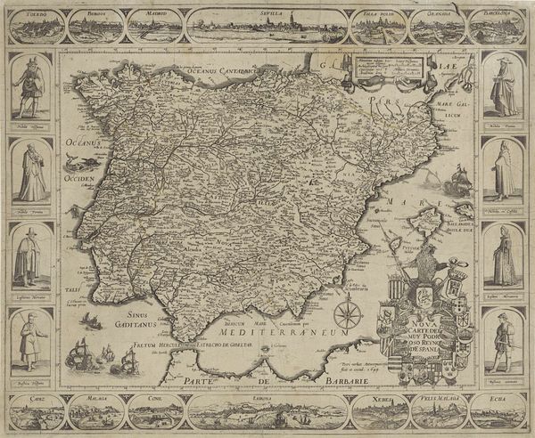 Editor: This is “Kaart van Vlaanderen,” a 1559 engraving currently held at the Rijksmuseum. Looking at this map, I’m struck by how it tries to blend objective geographic data with these symbolic, almost heraldic images. It makes me wonder: what do you see in this piece? Curator: It’s fascinating how these early maps weren't just about accurate representation. They actively constructed a visual language that encoded power, identity, and a particular worldview. The "Kaart van Vlaanderen," wasn't just showing the land, but also staking a claim, visually articulating who belonged and who controlled that territory. How do you think the inclusion of those heraldic symbols contributed to this articulation of power? Editor: That’s interesting! So, they weren’t necessarily trying to be neutral? Maybe the choice of which towns to include, or even the way the coastlines are drawn, could also carry a kind of symbolic weight? Curator: Exactly. The map becomes a political stage. Think about the concept of 'cartographic violence,' where maps can be instruments of colonization and oppression, erasing indigenous presence or reinforcing colonial boundaries. How might this map, even in its relatively early form, foreshadow some of those later uses of cartography? Who has access to and the authority to create maps are also questions that comes to mind. Editor: It sounds like, far from being just an objective document, this map is participating in some heavy social and political dialogues. That’s made me look at it with a whole new perspective! I'd thought of it only as an archaic object, not as an agent itself. Curator: Right. By questioning what appears ‘objective,’ we can understand how power is embedded in visual culture. And in this case, how the mapping of space is the assertion of place and belonging.