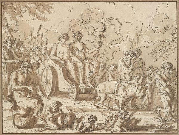Editor: This drawing, "Alexander and Bucephalus," is from the 17th century, artist unknown, rendered in ink. I’m struck by the contrast between the calm, almost theatrical scene on the right, and the much more active, chaotic image on the left, like there are two different moments being represented at once. What's your read on this work? Curator: It's interesting you pick up on that contrast, as it reflects a common theme in historical depictions of Alexander the Great. Observe how Bucephalus, untamed by others, kneels before Alexander, acknowledging his destiny. What does this tell us about leadership, particularly in the 17th century? Editor: It makes Alexander seem almost divinely appointed, if a wild horse is submitting to him like that. It creates a clear visual of his power. But what about the right side with the women gesturing, is that part of the story? Curator: Precisely! The right side depicts a courtly setting. Notice the gestures. It's a classical pose indicating speech, maybe council. Combined with Alexander’s domination over Bucephalus, it visually expresses not only physical power, but the ability to lead and persuade, two vital aspects of a ruler then, and arguably even now. Editor: I never would have put that together, but I see the link now. The symbols show his strength to conquer as well as command, it's like two halves making a whole. Curator: Indeed. Think of how important inherited symbols were for people and power at the time this work was created. This is cultural memory visualized; leadership idealized through historical and symbolic lenses. Editor: It's fascinating how much meaning is packed into one image. Thanks for illuminating those hidden layers! Curator: My pleasure. The beauty of art lies in its ability to speak across centuries, using symbols to echo through time.