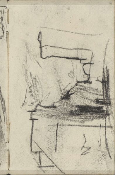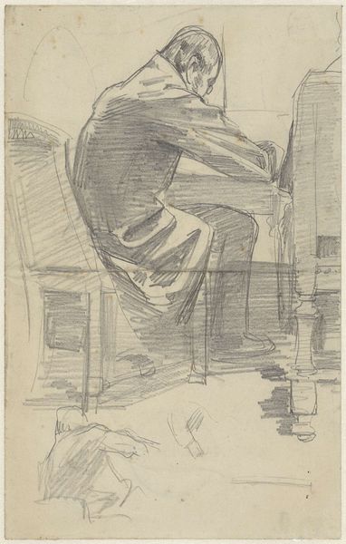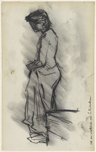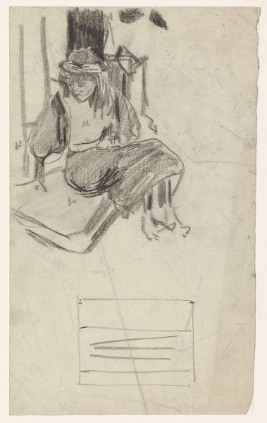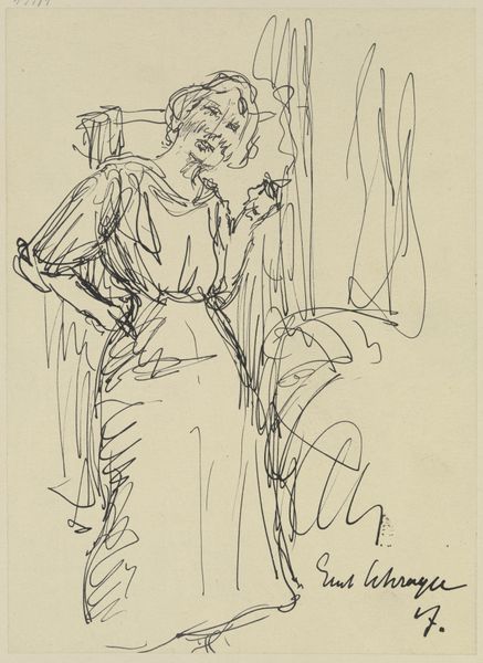 Curator: This pen and ink drawing is called "Dame ved vindue," or "Lady by the Window," created in 1933 and held at the SMK, Statens Museum for Kunst. What's your initial impression? Editor: She seems swallowed by the shadows. It's interesting, a drawing of a woman in a domestic space, but not really intimate. The lines are restless, like she’s about to vanish. Curator: I agree, there’s an ambiguity to her presence. Given the period in which this was created, it’s hard not to read into the figure's state of being in terms of broader historical narratives of gender roles, visibility, and representation within increasingly complex socio-political contexts. Editor: Absolutely, you sense it wasn't a simple, lighthearted rendering. She is present, yes, in this outlined space, yet seems deeply disconnected from it. What do you notice about the window and the plants next to it? Curator: The window could symbolize potential, opportunity, a world beyond domesticity, while the plant, being cultivated, remains confined. I wonder how the lady perceives her surrounding: entrapment or serenity? Editor: Entrapment feels right. There is the plant enclosed, but also the woman inside the house, which also feel enclosed, like a shadow is embracing the room. I am moved by this simple composition. Curator: It's a fascinating study in interiority, both literal and psychological. The sharp lines evoke the discomfort that is at hand. How the external and the internal shape each other in very direct way. Editor: Indeed. And, perhaps, the figure in the window offers just enough uncertainty for the viewers to find some part of themselves also mirrored there. Curator: It strikes me how the sparseness enhances the emotional weight. It highlights the subtle rebellion embedded in quiet introspection. Editor: Yes, she's not actively resisting. Maybe the lady has resigned herself to it, looking pensively towards her surroundings as her next endeavor. And those muted shades certainly evoke a pensive and sober sensation. Curator: Thank you! The piece really embodies intersectionality, the dialogue between subject, object, space, time, and societal roles of women. Editor: It has been an interesting experience! And you’re welcome! It leaves you to consider what exists outside, what she ponders when left alone to her interior universe.