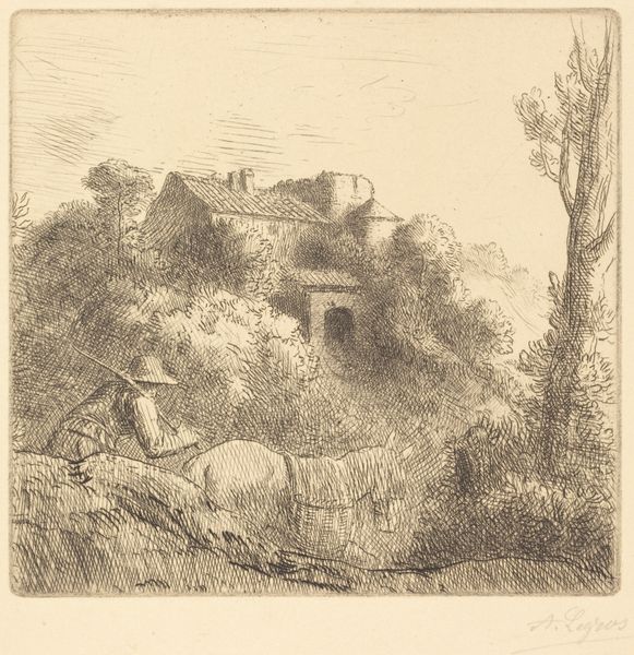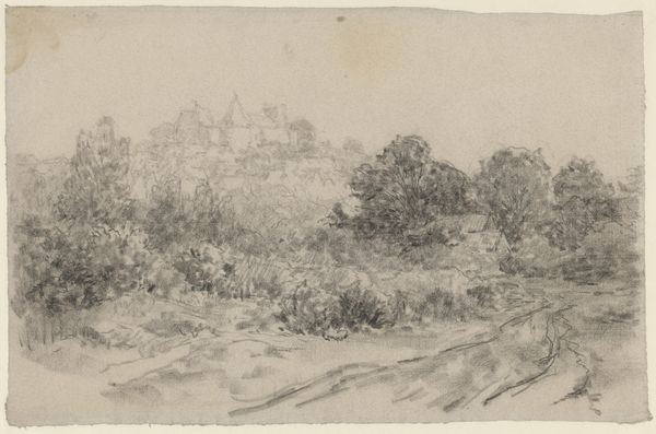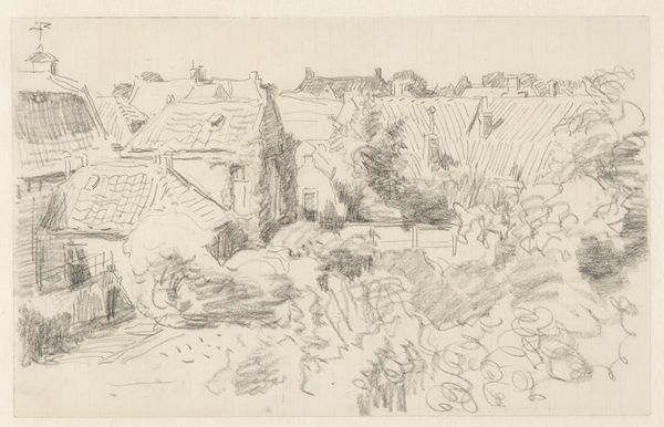 Editor: This drawing, titled "Houses with Chimney," is a pencil sketch by Otto Scholderer, we don't know exactly when it was created. It’s mostly rendered in muted tones, soft pencil marks depicting structures almost obscured by foliage. It's quite a subtle composition. How do you interpret this work? Curator: I see this as a quiet, yet powerful, commentary on the relationship between humanity and nature. Look how the buildings are almost swallowed by the landscape. Doesn’t it suggest something about our impact, or lack thereof, when juxtaposed with the enduring force of the natural world? Consider the historical context. What social narratives might be woven into a seemingly simple landscape drawing of houses with chimneys? Editor: Well, the way the houses blend almost seamlessly into the landscape makes me think about ideas of belonging and home, but also maybe the impermanence of things. Curator: Exactly! And let’s think about who these houses might belong to. What socioeconomic factors dictated who had access to such dwellings? Whose labor built those chimneys, fueled the fires within? We need to think critically about representation and access, even within this delicate pencil sketch. How does viewing this through a contemporary lens change our perspective? Editor: I never would have considered that perspective initially. Now, seeing the chimneys amidst the overgrown foliage, it speaks volumes about land ownership and the history of resource use. It highlights the contrasts. Curator: It is crucial to remember that art isn’t created in a vacuum. Every stroke, every composition, echoes the sociopolitical landscape from which it emerges. This drawing isn't just a landscape; it’s a document reflecting historical and social complexities. Editor: This really does change my view of the drawing! I’ll definitely be thinking about those connections when looking at landscapes in the future. Curator: Excellent! Approaching art with such questions helps unlock deeper understandings of both the artwork and ourselves.