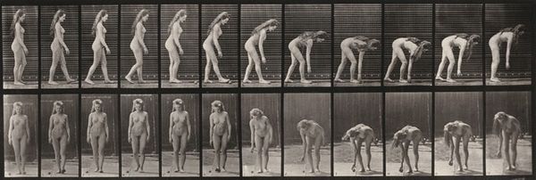 Editor: Eadweard Muybridge's "Plate Number 213. Lifting and emptying basket," created in 1887, is a gelatin silver print. It shows a sequence of a woman’s actions. It's quite clinical in its approach, like a scientific study of movement. What's your perspective on this particular piece, considering its historical context? Curator: Ah, yes, Muybridge. For me, these motion studies are less clinical and more like captured poems. Think about it: the Victorian era, obsessed with classifying and knowing, meets the very human desire to dance, to work, to simply *be*. This particular image makes me consider our relationship with labor. Lifting and emptying – the mundane tasks elevated by the sheer act of observation. What story do you think she's trying to tell through these poses? Editor: I suppose it shows how photography could be used as a tool to study the human body, something revolutionary back then. But what about the fact that the figure is unclothed? Does that add another layer of meaning or commentary? Curator: Absolutely! It strips away the societal artifice, leaving the essential form. It’s both vulnerable and powerful, isn't it? Consider how rarely women controlled their own image in art back then. Muybridge inadvertently gave this woman a platform, a chance to script her own performance. Though, of course, he was orchestrating the scene. Perhaps the tension between control and liberation is precisely what makes it so captivating. Do you get the sense that this changes how we view art from that time? Editor: It really does. I never thought about it that way – seeing her actions as a type of performance. It really invites a whole new dialogue with the image. Thank you! Curator: The beauty, isn't it, is finding these fresh dialogues within old frames? Keeps us all moving, thinking.